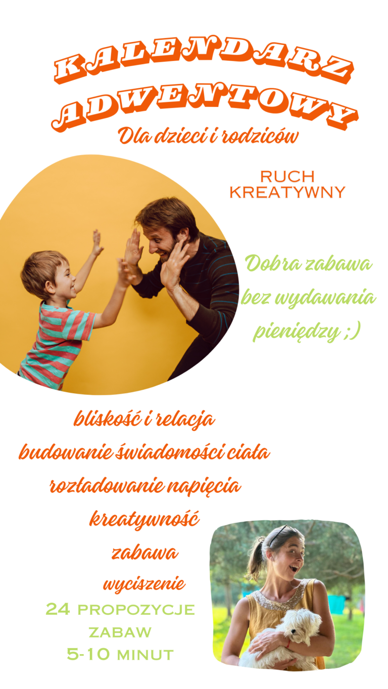 Czy Twoje dzieci uwielbiają kalendarze adwentowe? Moje tak i zawsze się o nie upominają. Ze sklepowych półek krzyczą czekoladowe potwory na 24 dni, a w necie aż roi się od super hiper pomysłów na własnoręcznie wykonane kalendarze, od sierpnia, po nocach. Nie jesteś też przekonana do kupowania małych plastikowych drobiazgów, które za moment wylądują na podłodze w stercie innych zabawek. I nie daj boże jeszcze na nią staniesz w nocy. Szukałam pomysłu, który będzie pasował do mojej rodziny i wartości. Czyli mało czasu, bezkosztowo i bezcukrowo. I tak narodził się pomysł Poruszonego Kalendarza Adwentowego dla dzieci i rodziców. Podrzucam Ci 24 pomysły na Dobrą Zabawę, czyli Kalendarz Adwentowy dla dzieci i rodziców. Możesz dopasować go do swojej rodziny:) |