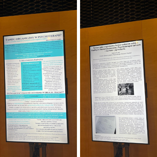 Kilka miesięcy wcześniej z wielkim powątpiewaniem zgłosiłam swój poster – plakat pt. Taniec organiczny w psychoterapii? O tym, co ludzie rozumieli intuicyjnie, a dziś wyjaśnia nauka, spodziewając się, że zostanie odrzucony, bo taniec, bo mało naukowe, bo bez badań… Jednak ku mojej wielkiej radości i nie mniejszemu zaskoczeniu mój poster został zaakceptowany!!! Uczestniczyłam zatem nie tylko jako odbiorca, ale także miałam swój mikro wkład w tworzenie tego wydarzenia oraz budowanie świadomości na temat psychoterapii tańcem i ruchem.
