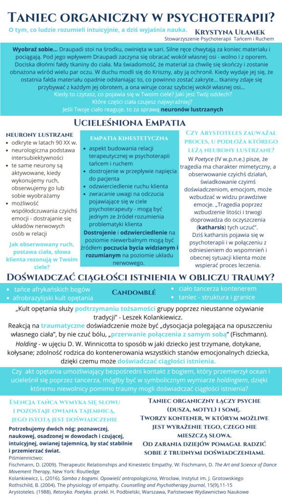 Poster podzielony jest na dwie części i zaprasza do refleksji nad naturą tańca organicznego, czyli żywego, prawdziwego, jako integralnej części życia człowieka od zarania dziejów. Był wyrazem życia wewnętrznego, źródłem zmiany, drogą budowania wspólnoty, a także sposobem radzenia sobie z przytłaczającymi doświadczeniami. W posterze łączę perspektywę psychoterapeutyczną i antropologiczną, które wzajemnie się przenikają. Zapraszam do refleksji na temat tego, co ludzie rozumieli intuicyjnie zanim z wyjaśnieniem pospieszyli naukowcy.